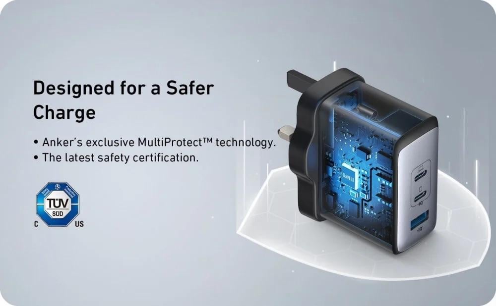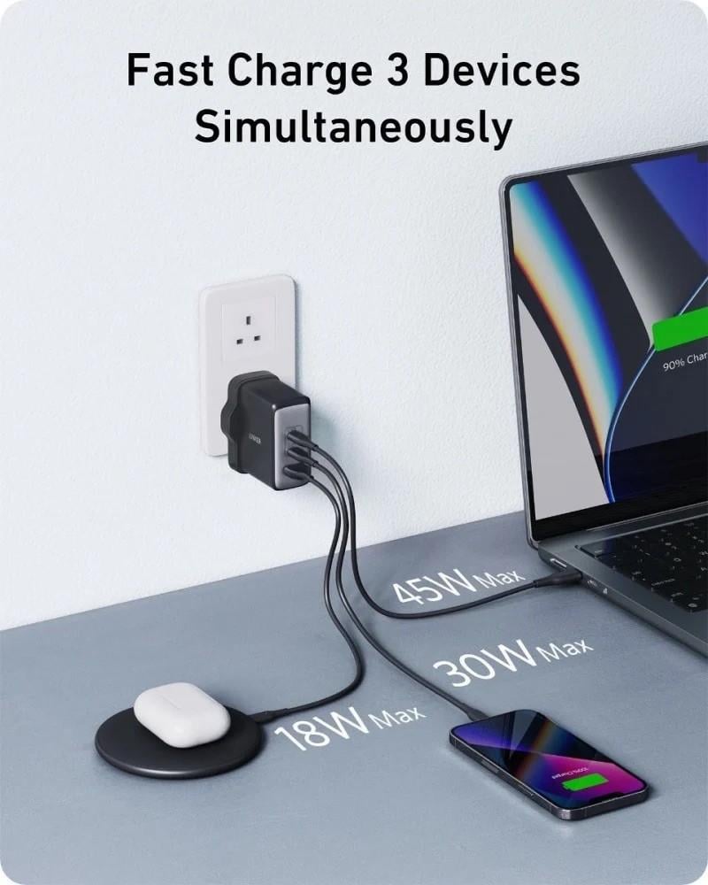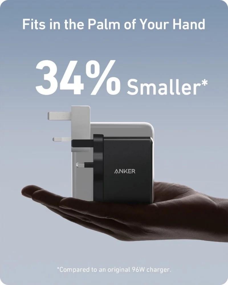- صغير الحجم بفضل تقنية GaN (نيتريد الغاليوم) – أداء عالي بحجم مدمج