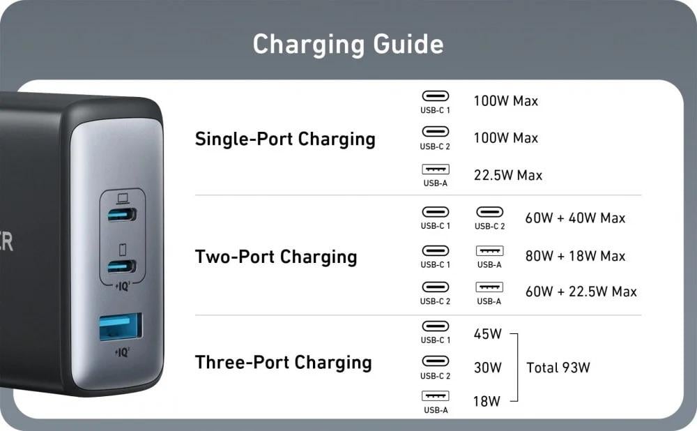 - USB-C1: 60W + USB-C2: 20W + USB-A: 20W