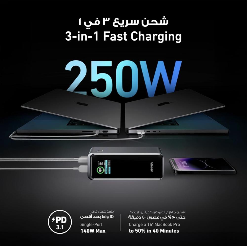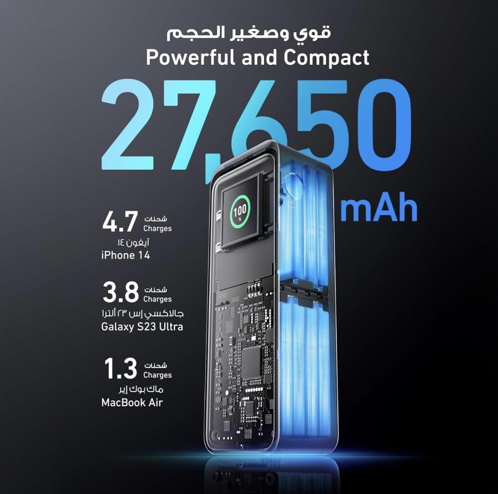 بطارية Anker Prime 27650mAh بقوة 250 واط هي واحدة من أقوى محطات الطاقة المحمولة المتوفرة حاليًا، وتُعد مثالية لشحن أجهزة الكمبيوتر المحمولة والهواتف الذكية والأجهزة اللوحية بسرعة وكفاءة